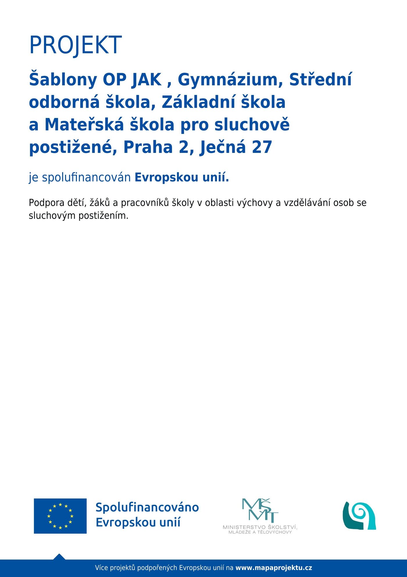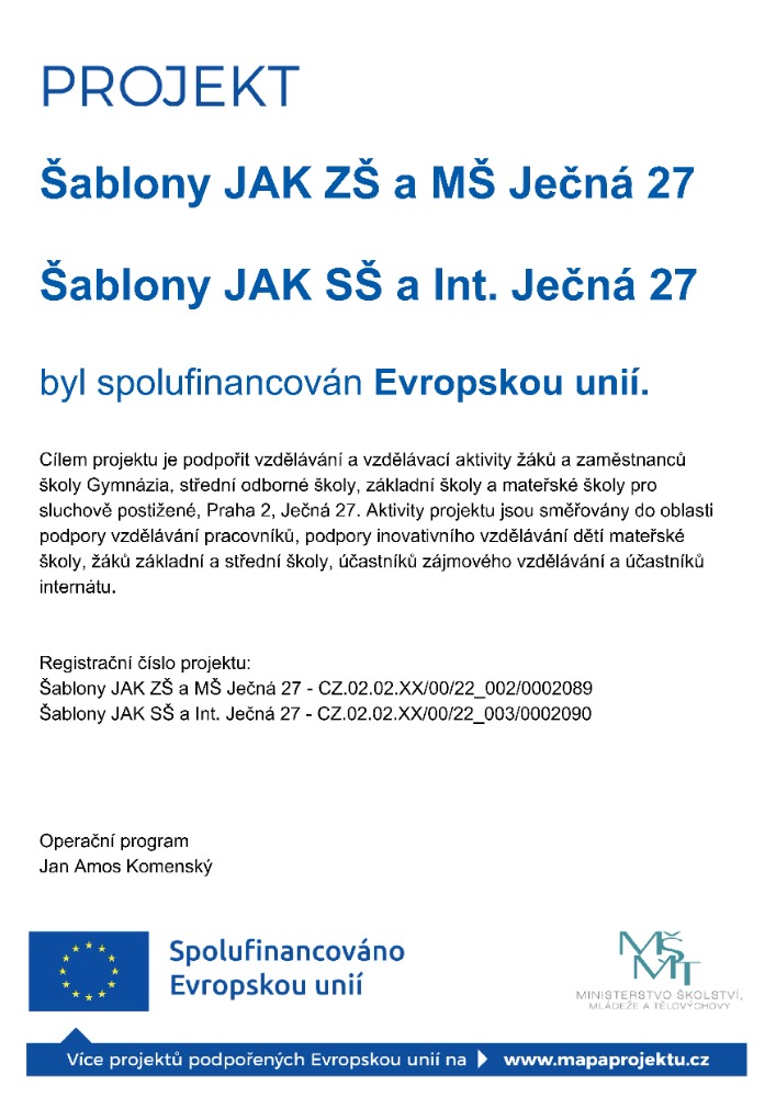 Škola je příjemcem podpor poskytovaných EU v rámci projektu Šablony OP JAK do roku 2027.